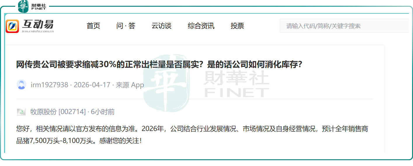 4月20日,有投資者在互動平台向牧原股份(02714.HK)提問,就網傳公司被要求縮減30%正常出欄量的消息真實性及庫存消化方案進行求證。