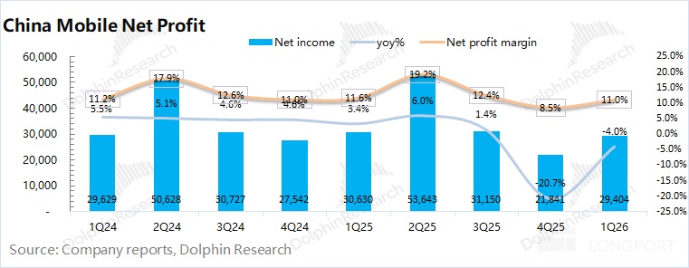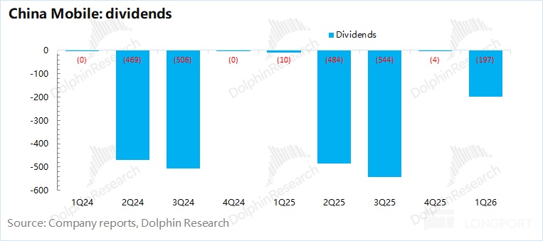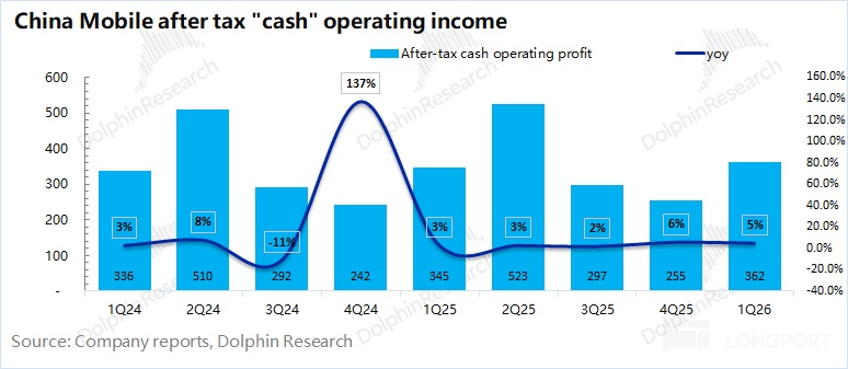 中國移動 2026 年第一季度淨利潤 294 億元,同比下滑 4%。由於公司的折舊攤銷高於資本開支,從現金流的角度看,公司本季度的稅後現金性經營利潤爲 362 億元(不考慮非經營因素影響),同比也有 17 億元的提升。