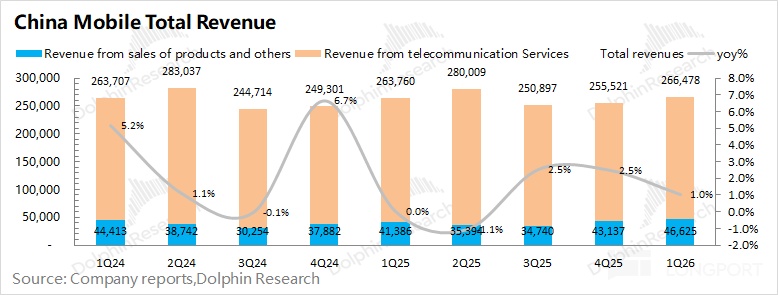 中國移動 2026 年第一季度總營收 2664.8 億元,同比增長 1%。分項來看,其中公司本季度來自於通訊服務的收入爲 2198 億元,同比小幅下降 1.1%;來自產品銷售及其他的收入爲 466 億元,同比增長 12%,是公司本季度增長的主要推動力。