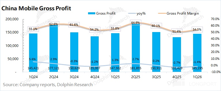 中國移動 2026 年第一季度毛利率 54.5%,同比下降 1.3pct。海豚君將 “網絡運營及支撐成本” 和 “銷售產品成本” 列爲營業成本,進而測算公司毛利及毛利率情況。
