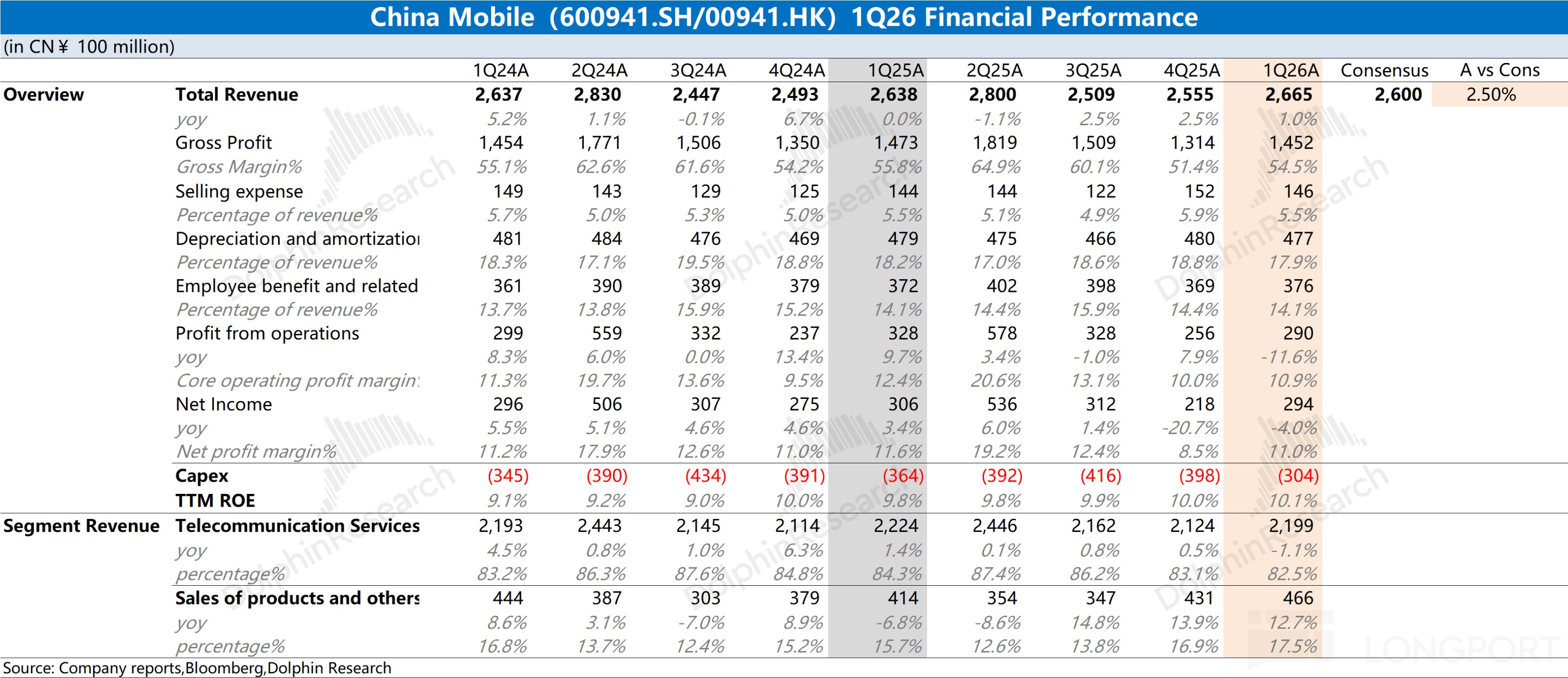 中國移動(600941.SH/00941.HK)於北京時間 2026 年 4 月 20 日晚的港股盤後發佈了 2026 年第一季度財報(截止 2026 年 3 月),要點如下: