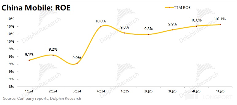4、ROE 及分紅情況:$中國移動(600941.SH) 本季度的 TTM ROE 爲 10.1%,同比增長 0.3pct。公司過往分紅往往在二三季度,公司本季度分的 197 億元,實質上是二季度分紅的前置。