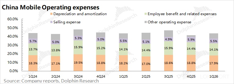 中國移動 2026 年第一季度經營費用 1162 億元,同比增長 1.5%。海豚君將 “銷售費用”、“僱員薪酬費用”、“折舊及攤銷” 和 “其他營運支出” 四項都放在經營費用中;