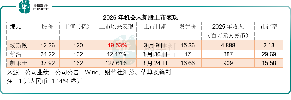 但進入2026年,市場情緒悄然轉向理性,甚至帶著幾分謹慎,這種轉變在今年上市的三家機器人企業身上體現得淋漓盡致--埃斯頓(02715.HK)華沿機器人(01021.HK)凱樂士(02729.HK)三家企業上市時間相近、同屬智能製造賽道,共享機器人產業發展的行業紅利,卻走出了截然不同的股價行情,凱樂士上市後一路暴漲,華沿機器人穩步走強,而作為工業機器人龍頭的埃斯頓卻持續破發、估值低迷。