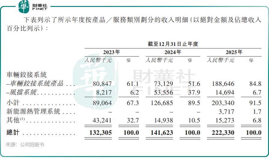 車輛鉸接系統是伊卡路斯主要收入來源,該系統包括鉸接盤及其相關的風擋系統等車輛鉸接系統產品,以及風擋系統。此外,伊卡路斯在2025年切入新能源汽車賽道,開拓了新能源熱管理系統的生產及銷售,該業務於2025年的收入不足400萬元(單位人民幣,下同)。