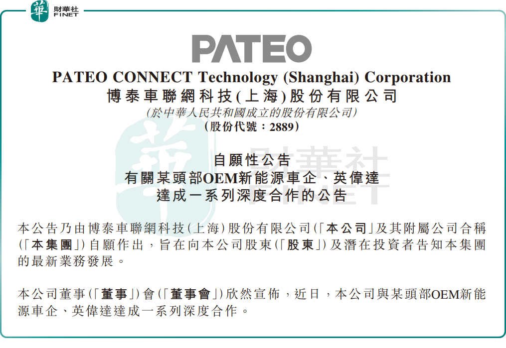 4月23日,博泰車聯發布重大業務合作公告,官宣與某頭部OEM新能源車企,及英偉達達成一系列深度合作。這一消息成為撬動股價反彈的核心利好。
