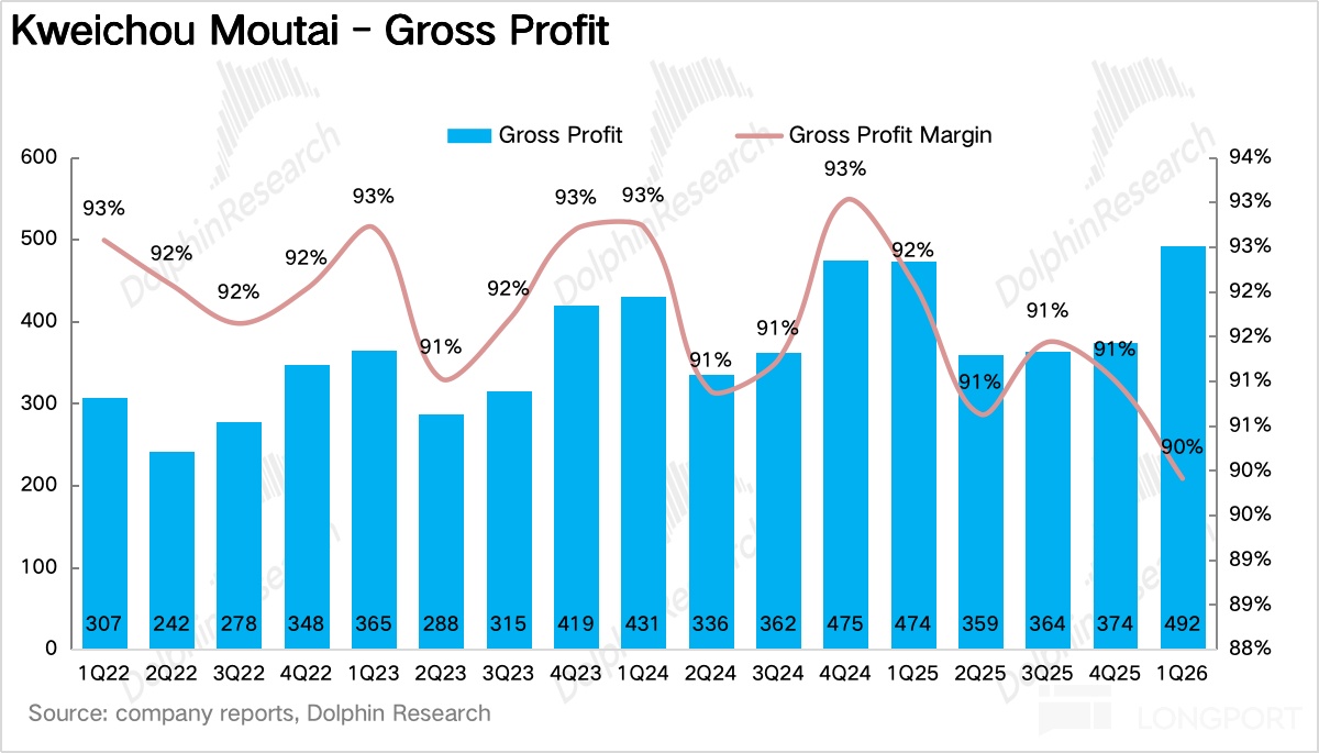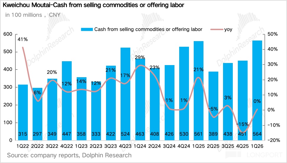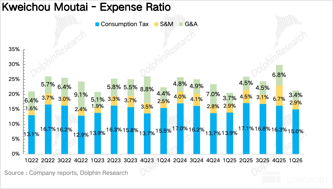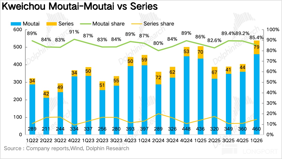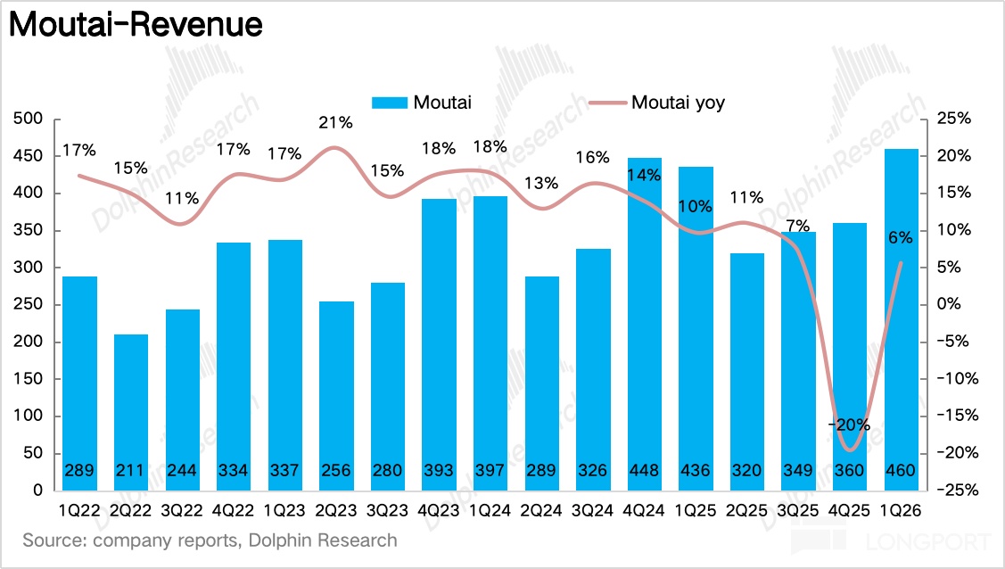 如果拆產品看,一季度最大的變化毫無疑問來自茅臺酒,尤其是飛天。1Q26 茅臺酒實現營收 460 億元,同比增長 5.6%。