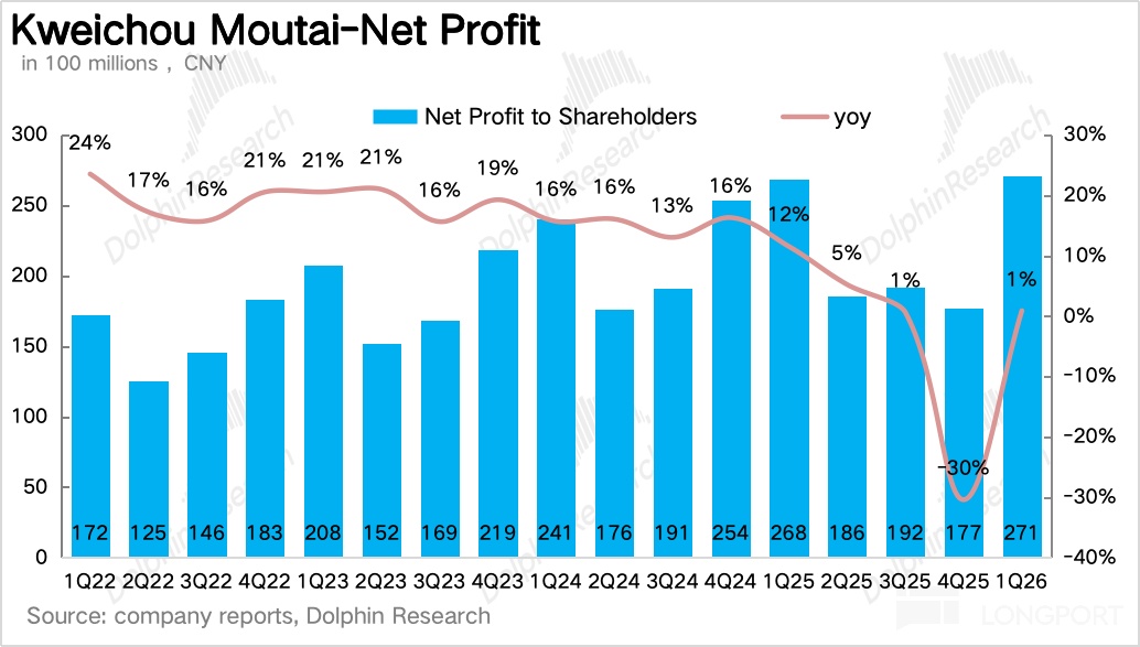 北京時間 4 月 24 日晚間,貴州茅臺(600519.SH)發佈了 2026 年 Q1 季度業績,整體上,作爲渠道改革落地後的首份業績,海豚君認爲茅臺整體表現還是不錯的,在去年同期高基數的情況下收入重回正增長,唯一的瑕疵在於非標酒降價、佔比減少的情況下公司利潤增速低於收入增速。$貴州茅臺(600519.SH)