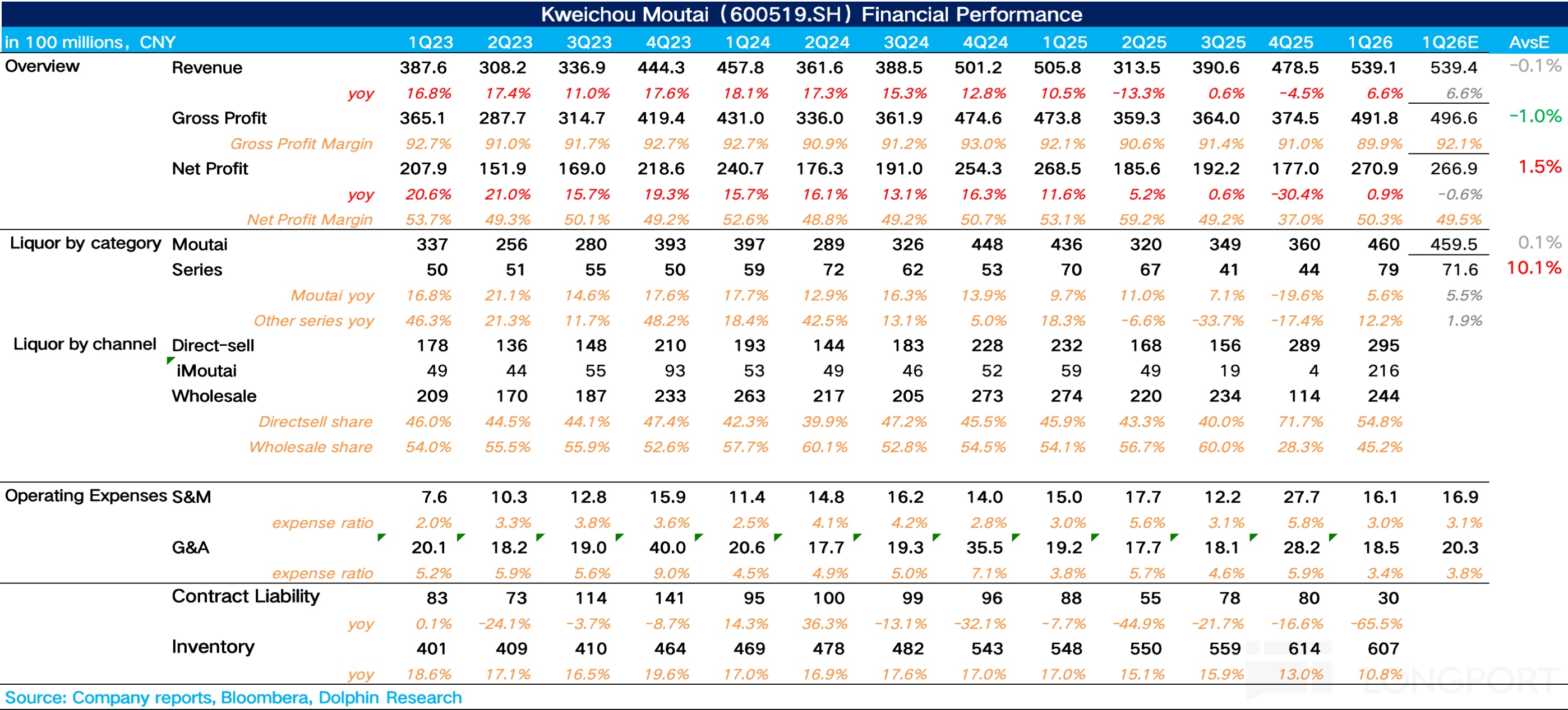 1、高基數下仍然實現正增長:1Q26 茅臺共實現營收 539 億元,同比增長 6.6%,核心在於 i 茅臺的改革紅利開始兌現。經過去年下半年公司主動降速,緩解渠道壓力,一季度市場需求從終端真實動銷向上傳導至報表端,增長基本告別了白酒行業傳統的 “渠道壓貨換增長” 模式,開始由 C 端消費接力。