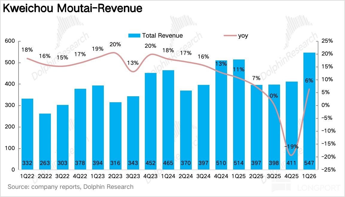 1Q26 茅臺共實現營收 539 億元,同比增長 6.6%,在經歷了去年下半年爲了穩批價、騰挪渠道、給 2026 年市場化改革讓路而做的主動犧牲,一季度迎來了報表端的第一個拐點。