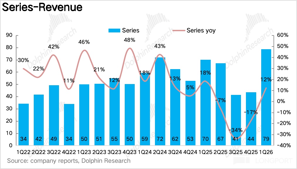 1Q26 系列酒實現營收 79 億元,同比增長 12.2%,經過去年 Q3、Q4 連續兩個季度的報表出清後重新迴歸雙位數增長。