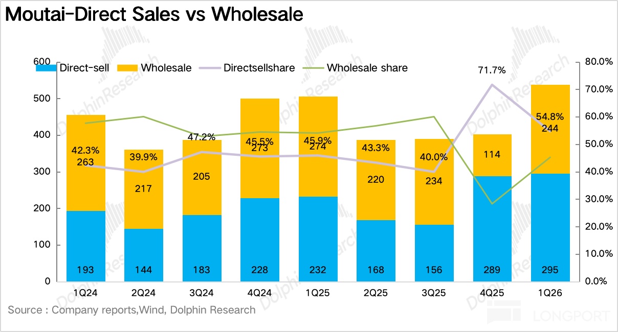 如果說產品端最大的變化是飛天迴歸,那麼渠道端最大的變化就是:直銷徹底成了主引擎。1Q26 茅臺直營渠道實現營收 295 億元,同比增長 27%,其中 i 茅臺實現營收 216 億元,佔比達到 73%。
