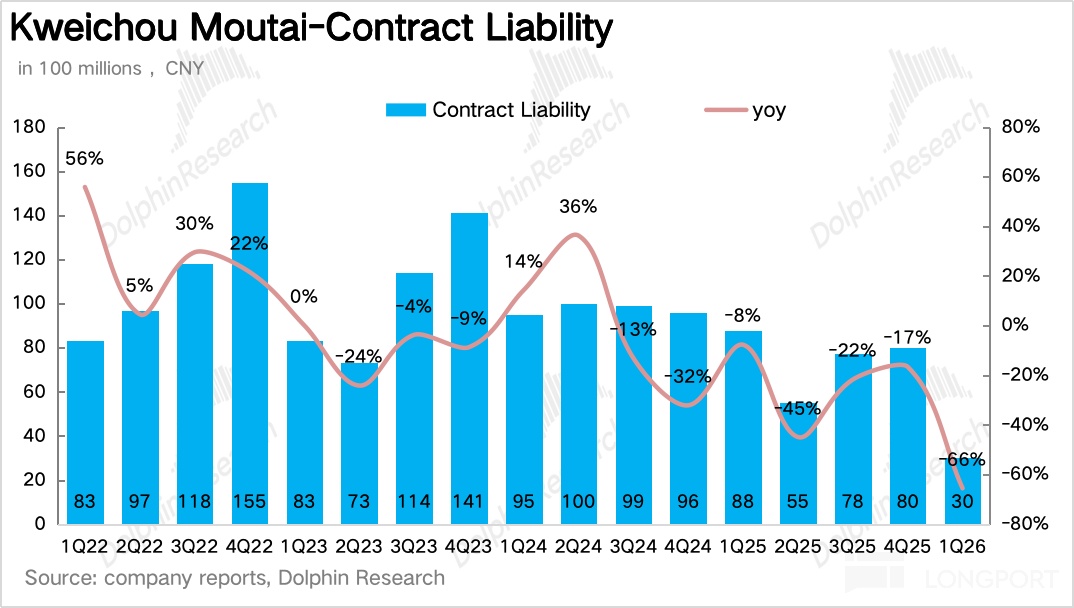 從 “蓄水池” 合同負債項看,截至一季度末茅臺合同負債爲 30 億元,同比下降 66%,一方面是由於直營佔比大幅拉高,砍掉了大量預售款基數(i 茅臺爲即時收入,不產生預售款),另一方面,海豚君推測茅臺在一季度進一步收緊了對經銷商的預售款要求,只收必要的備貨款,不再提前鎖定大額預售款。