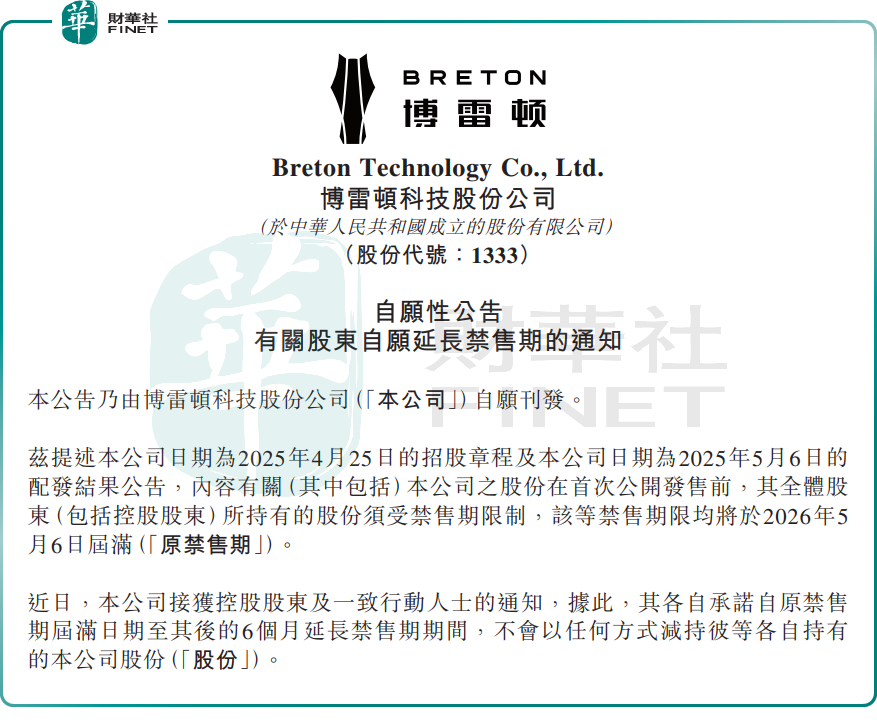 4月28日,博雷頓發布公告稱,就公司股份在首次公開發售前,其全體股東(包括控股股東)所持有的股份須受禁售期限制,該等禁售期限均將於2026年5 月6日屆滿;現控股股東及一致行動人士承諾將禁售期延長6個月至2026年11月6日,期間不會以任何方式減持所持股份。