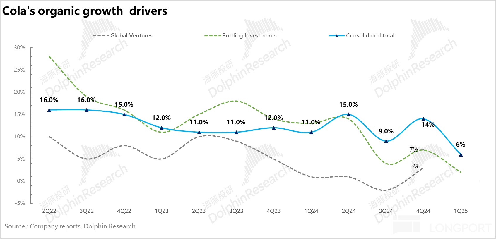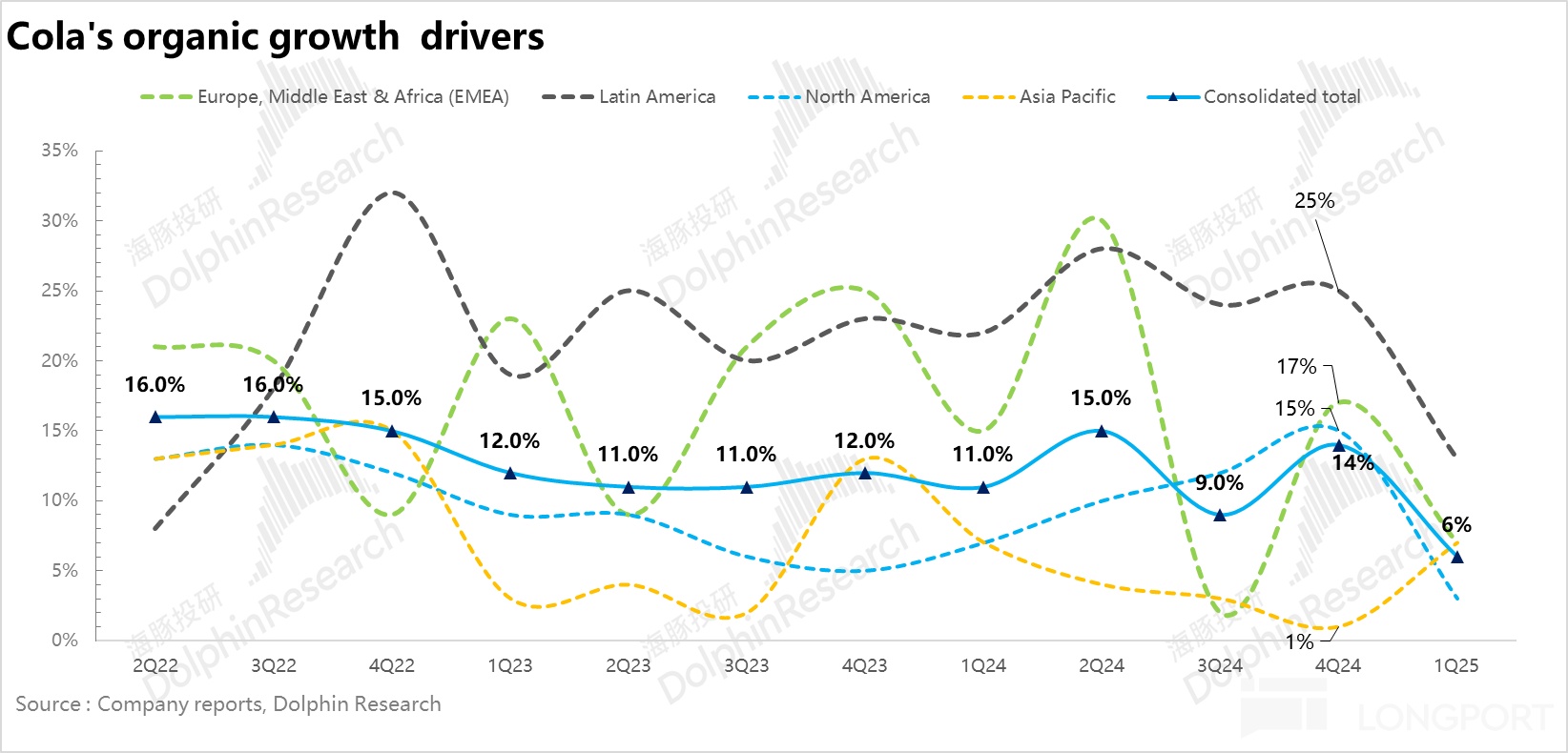 一季度在川普關稅大棒的揮舞下,可口可樂這個季度的業績依然體現出了非常強的韌性。雖然在部分發達國家(美國本土、西歐等地區)由於消費者消費信心受損,銷量端沒有達到預期,但公司在多數新興市場依然保持了快速增長對沖了發達國家銷量端的下滑。