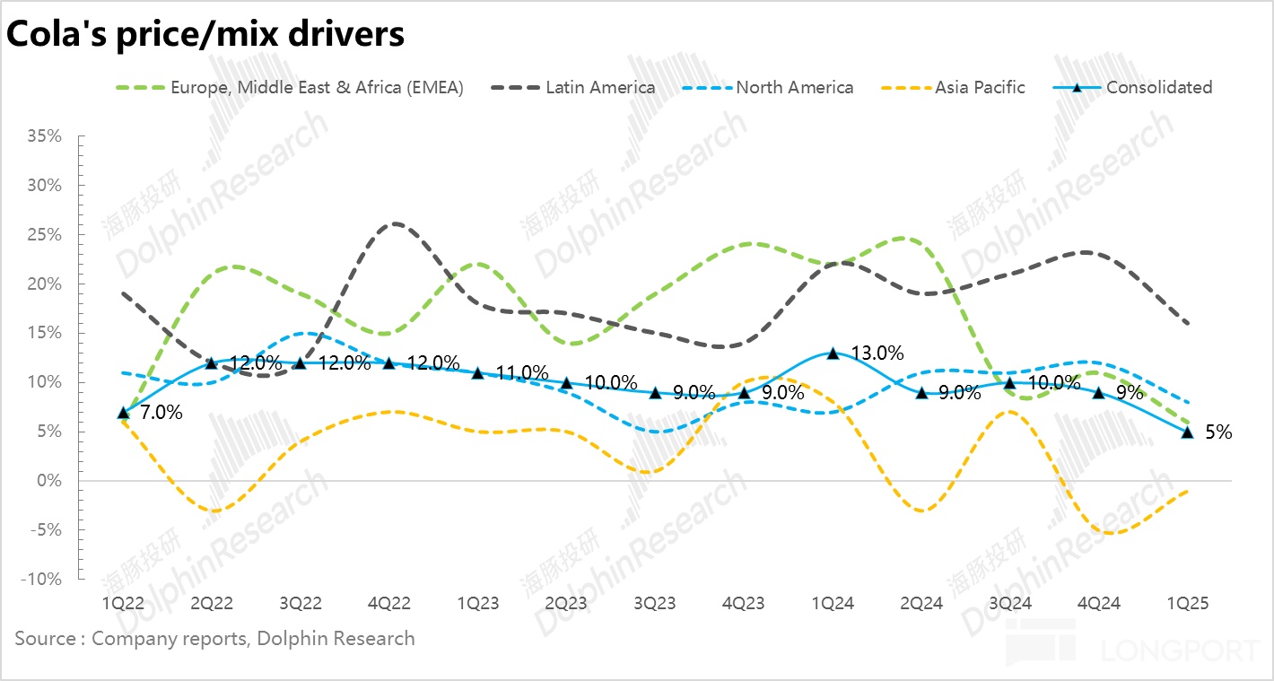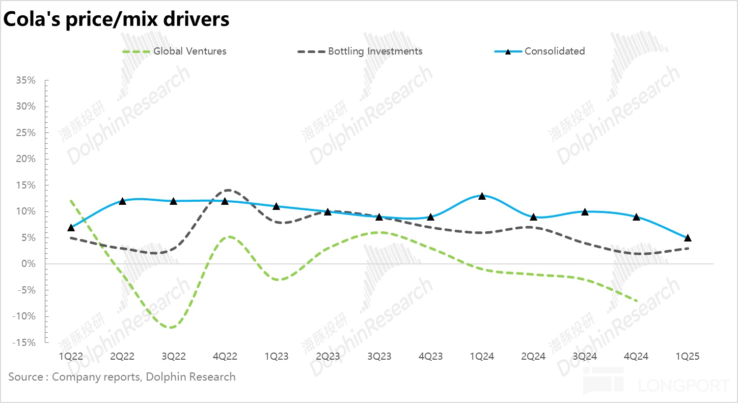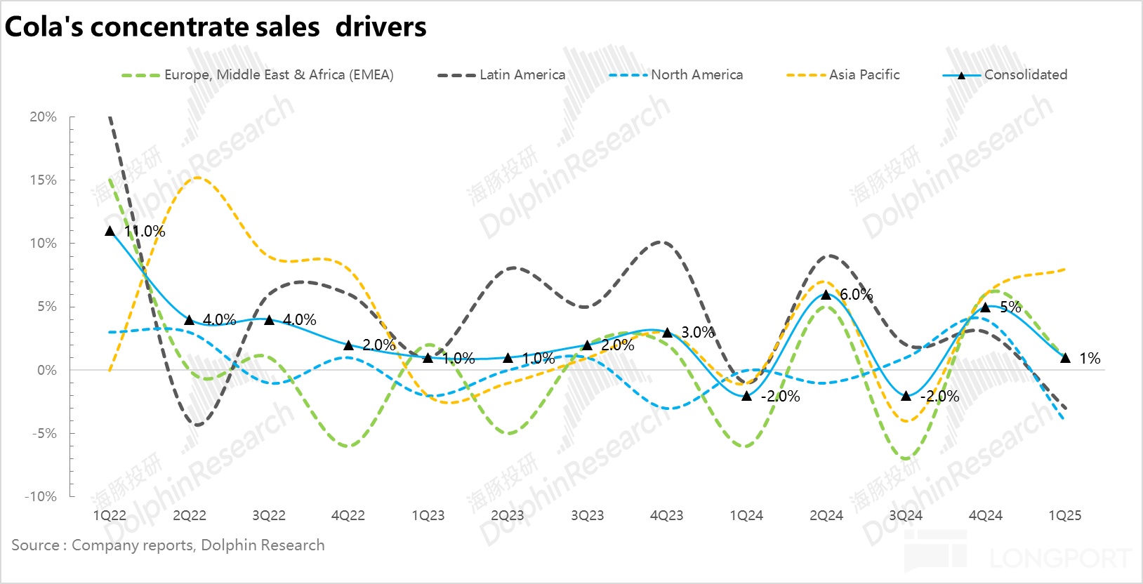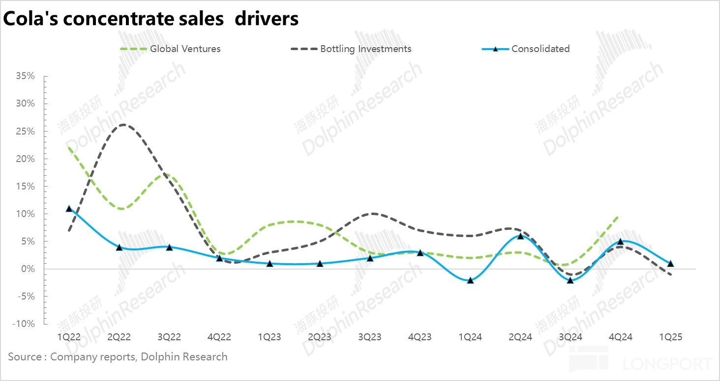 量:1Q25 濃縮液銷量同比增長 1%,由於發達國家健康意識不斷提升加上去年可口可樂在全球範圍內大面積漲價,市場對可口可樂銷量端的預期本就不高,因此這次銷量端反而超出了市場一致預期(市場預期銷量端不增長)。