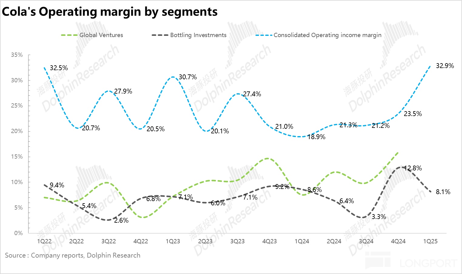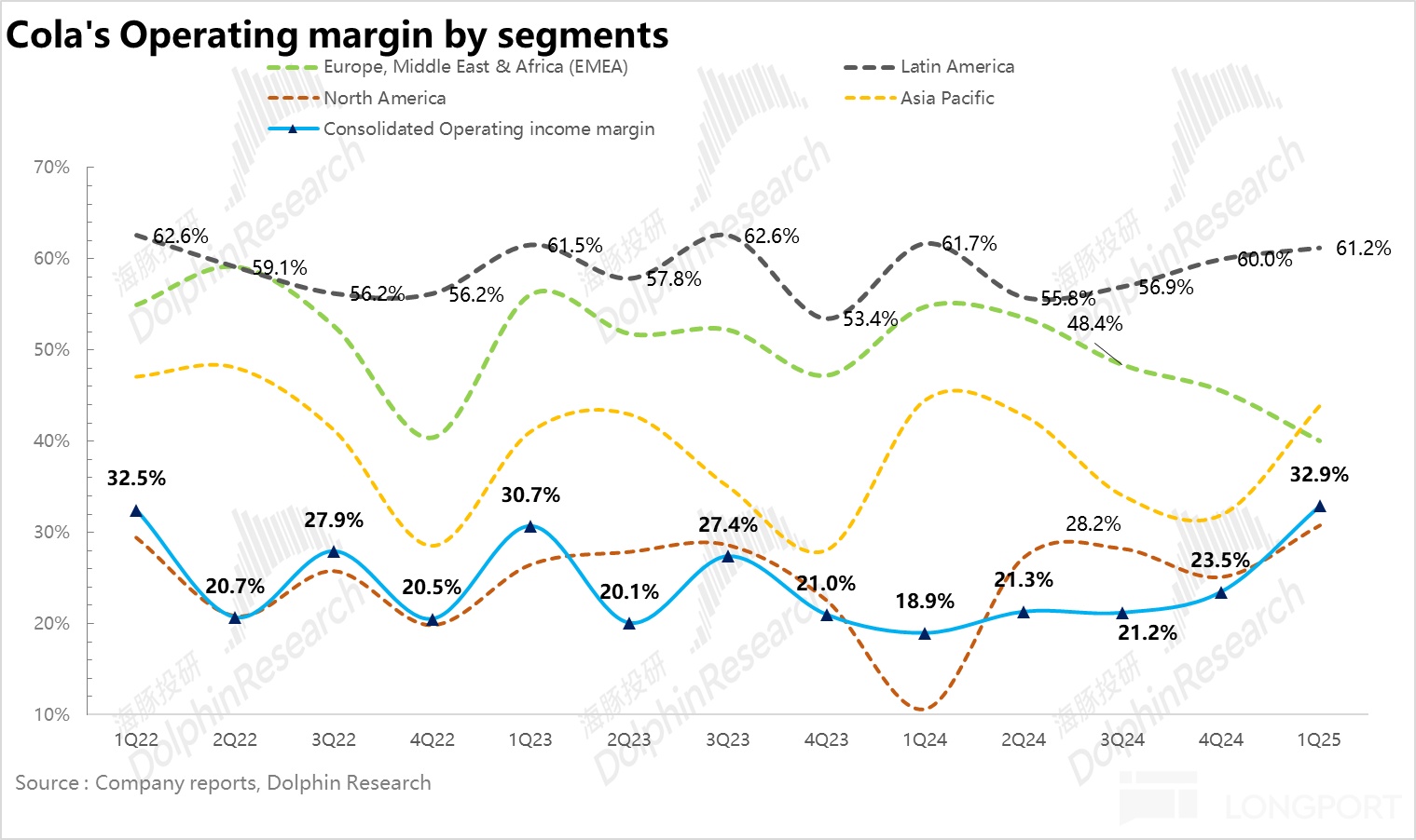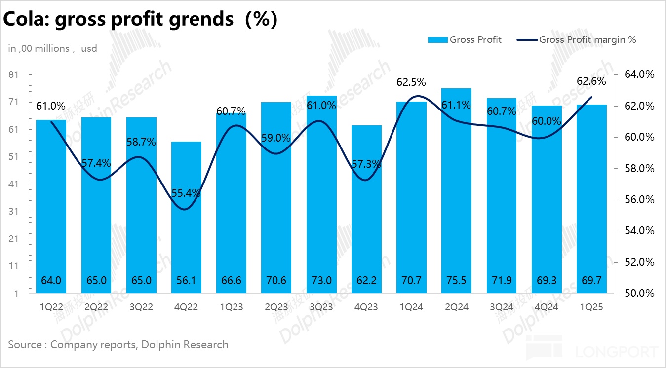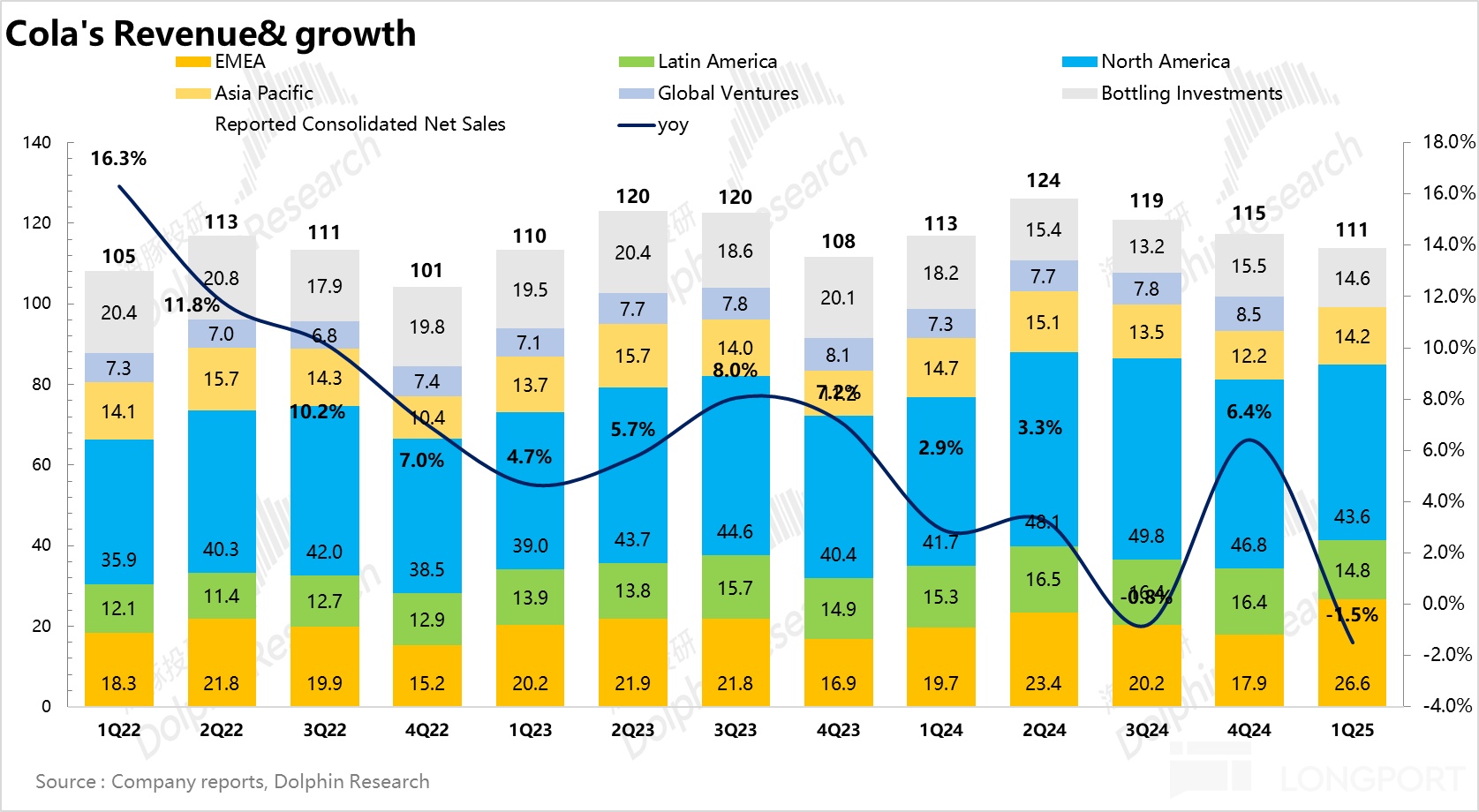 量:1Q25 濃縮液銷量同比增長 1%,由於發達國家健康意識不斷提升加上去年可口可樂在全球範圍內大面積漲價,市場對可口可樂銷量端的預期本就不高,因此這次銷量端反而超出了市場一致預期(市場預期銷量端不增長)。