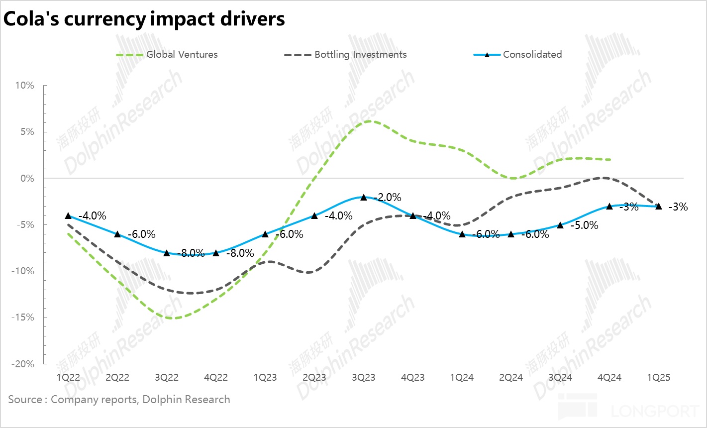 1、內生增長有所降速:1Q25 可口可樂實現表觀營收 111.3 億美元,同比下降 2%,和市場預期基本一致,其中內生營收(Organic revenue)同比增長 6%,量價拆分看,濃縮液銷量增速和價格增速分別同比增加 1% 和 5%。由於發達國家健康意識不斷提升加上去年可口可樂在全球範圍內大面積漲價,市場對可口可樂銷量端的預期本就不高,因此這次銷量端反而超出了市場一致預期。此外,受到關稅大棒影響,美元指數在 Q1 走弱,公司外匯逆風的影響從-6% 收窄至-3%。