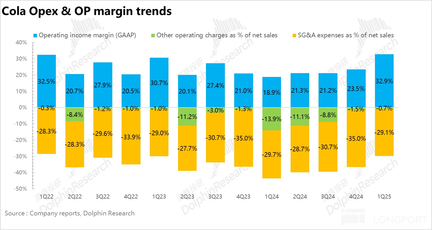 毛利率上,一方面可口可樂的核心原材料玉米糖漿在 Q1 價格有所回落,疊加可回收玻璃瓶在全球範圍內的廣泛使用有效節省了包裝成本,另一方面,公司通過直接提價&增加高毛利產品的佔比(比如無糖可口可樂、健康飲品份額提升)提升了公司的噸價,二者共同驅動下 1Q25 公司毛利率再度提升達到 62.6%