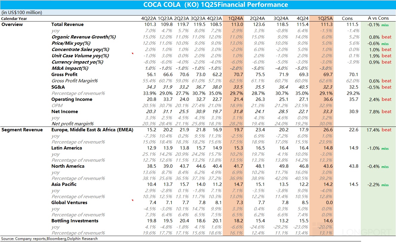 1Q25 可口可樂實現表觀營收 111.3 億美元,同比下降 2%,和市場預期基本一致,其中內生營收(Organic revenue)同比增長 6%,量價拆分看,濃縮液銷量增速和價格增速分別同比增加 1% 和 5%。由於飲料行業一季度是全年的消費淡季,因此增速有所回落在預期之內。
